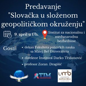 Prof. dr Ilija Životić je prisustvovao predavanju o položaju Slovačke u geopolitičkom okruženju, održanom 9. aprila na Institutu za nacionalnu i međunarodnu bezbednost.  U diskusiji su učestvovali predstavnici univerziteta u Slovačkoj, diplomatskog kora i predavači sa Fakulteta bezbednosti.
